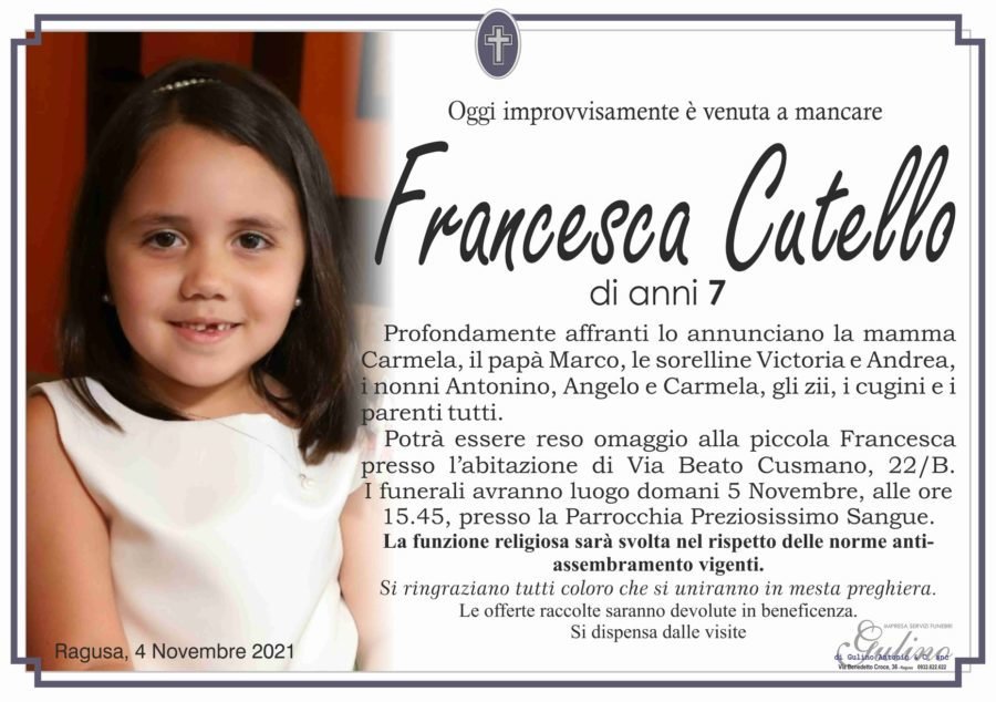 E’ stato celebrato ieri mattina, il funerale della bimba Francesca Cutello, morta a 7 anni nel sonno. Tantissimi i presenti per un ultimo saluto alla piccola e per dare un grande abbraccio ai suoi genitori, alle sorelline e i suoi cari.