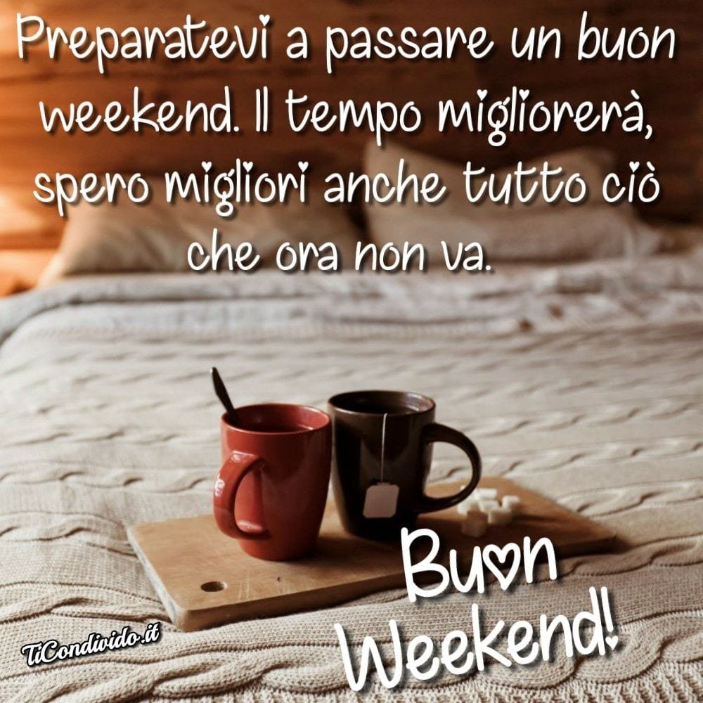 Buongiorno e buon week-end a tutti. Qui troverai tantissime frasi e immagini nuove per augurare un buon weekend ad amici, parenti e fidanzati. Scarica adesso gratis le immagini del buongiorno e copia-incolla le frasi per un buon weekend. Condividi gratis su facebook, instagram o whatsapp. Buon Week-end del 10 e 11 Aprile 2021. Buon fine settimana